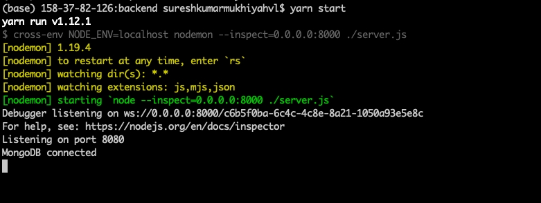 If your configuration and everything is correct, it should run the API at given port. You should be able to see the screenshot as shown below. Note the message that says MongoDB connected
